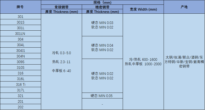 注:1.精密钢带有软态和硬态,硬态有1/4,1/2,3/4,H,EH,SHE;